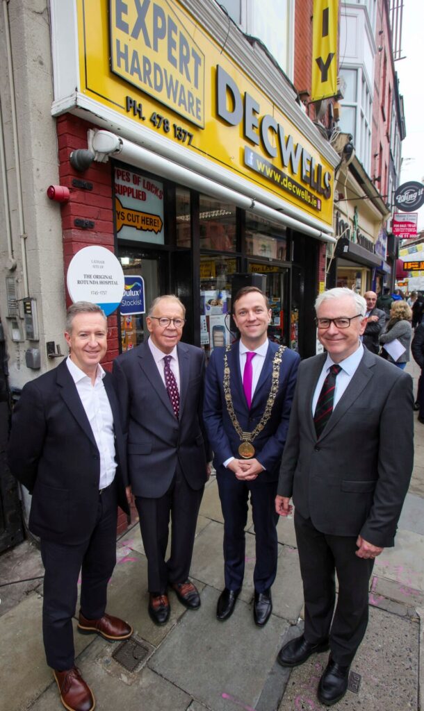 The plaque to commemorate the original site of The Rotunda Hospital was unveiled by Lord Mayor of Dublin, James Geoghegan and Professor Seán Daly, Master of the Rotunda. Decwells, founded by David & Monica Baker, are currently celebrating their 40th anniversary and have been working with The Master and the Historical Committee of the Rotunda Hospital and Dublin City Council (DCC) on this initiative for a number of years.